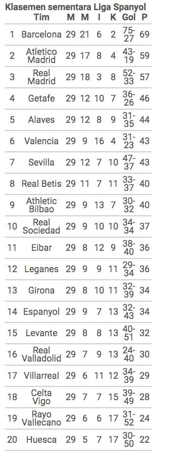 Di pertandingan lain yang berlangsung lebih awal, Valencia (43) berhasil menang di markas Sevilla (43) dengan skor 1-0 untuk melompati sang lawannya untuk naik ke peringkat keenam.